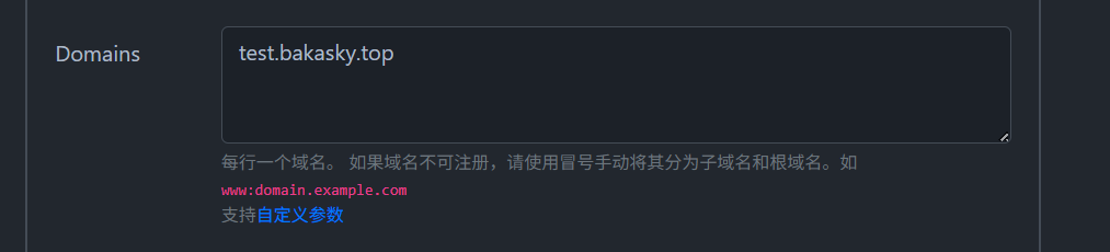 在Domains里填写你想要的域名(我以test.bakasky.top为例)